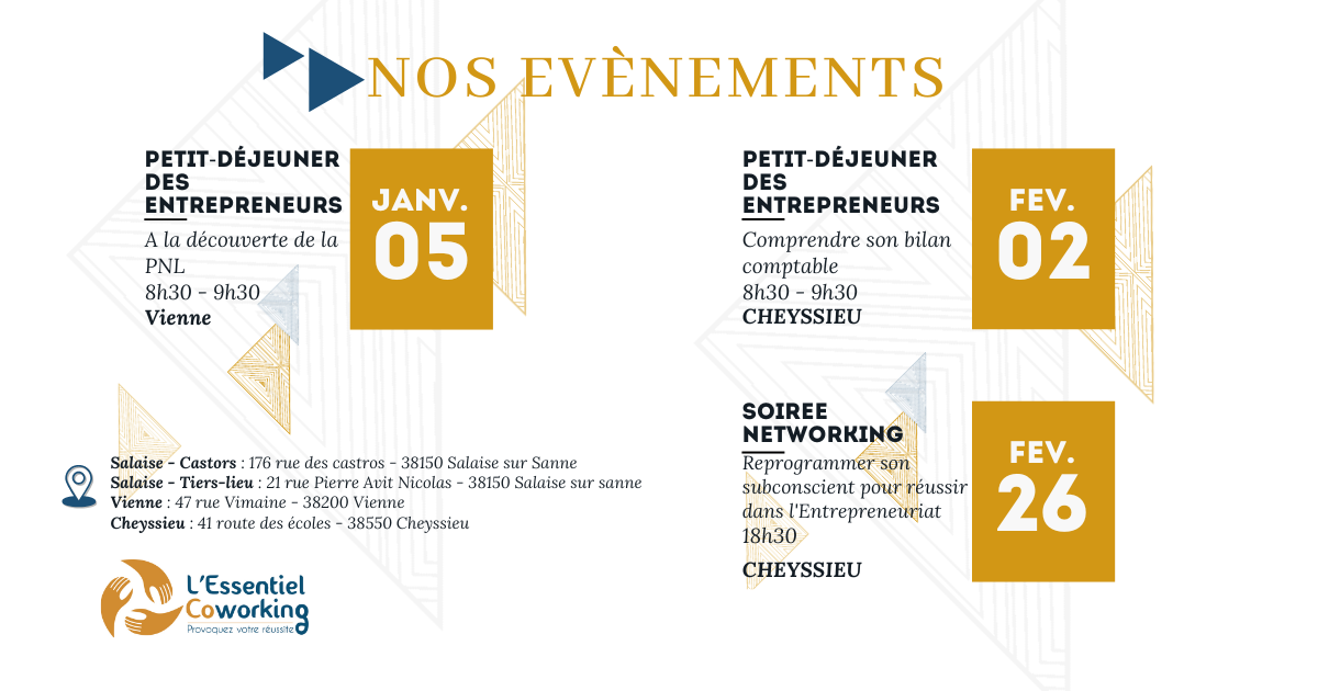 Au programme : petits déjeuners des entrepreneurs, petits déjeuners de l’entraide, ateliers, soirées networking, …